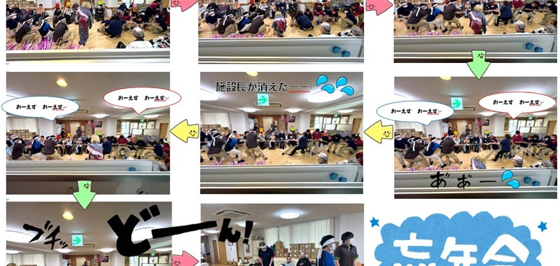 忘年会のメインは職員による二人羽織りと綱引き大会でした!