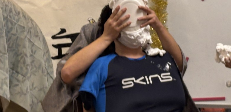 後ろに入っている職員の「3.2.1」の合図で顔面にパイが命中!